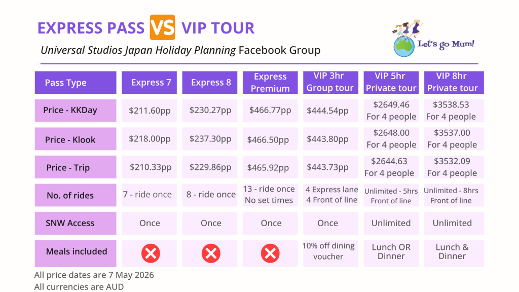 If you’re trying to decide between Universal Studios Japan Express Passes and VIP Tours, here’s an easy visual graph comparison table!