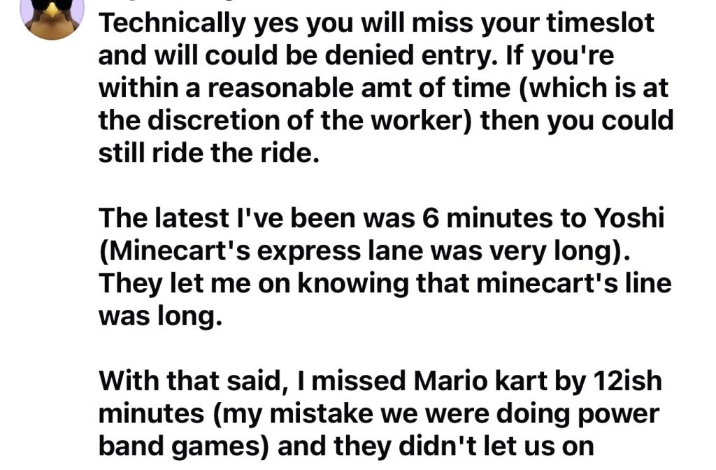 Some ride Express Passes have a time period to use them. If you arrive early you will need to wait before being allowed to enter the priority queue. If you arrive late you risk not being admitted. Our USJ Facebook group members write: