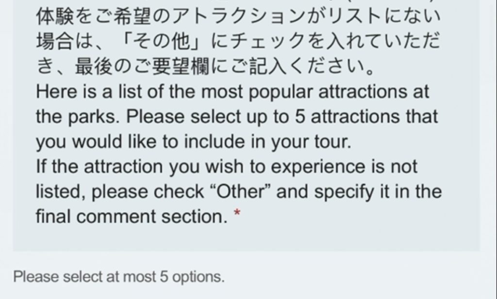 A detailed questionnaire form will be sent to you once your VIP Tour has been confirmed. There you can select or request the USJ activities and rides of most interest to you. Here are some screenshots from the form.