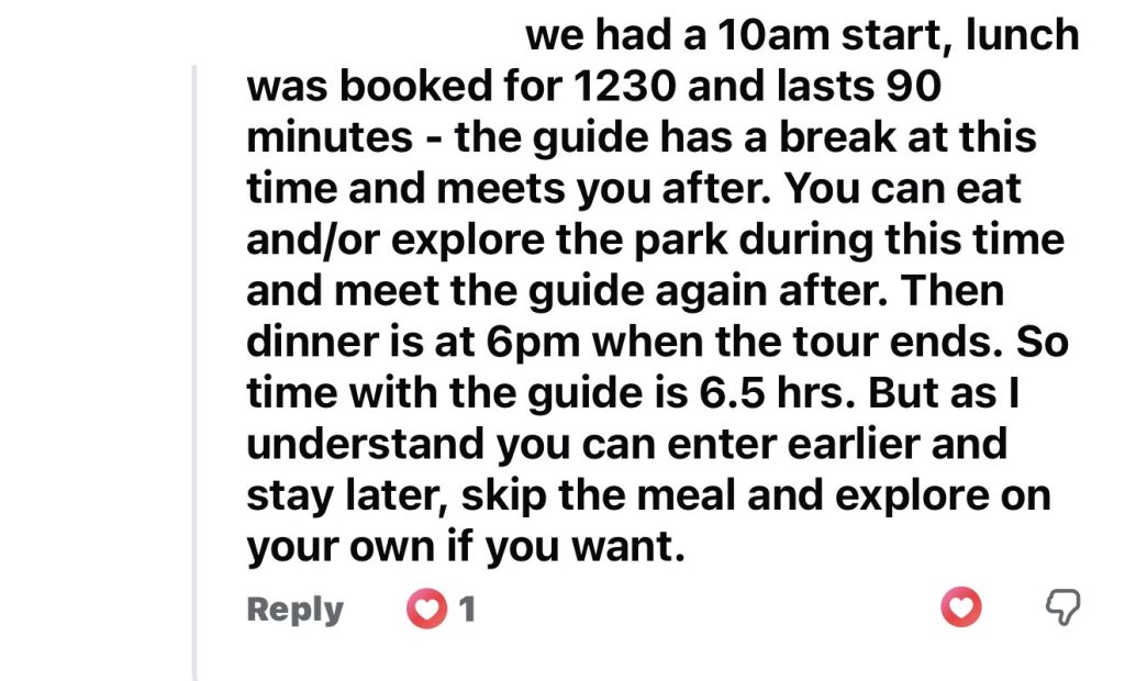 Your meals times will usually be arranged before your tour and are usually outside of your tour time itinerary. Your tour guide won’t be with you for meal times.